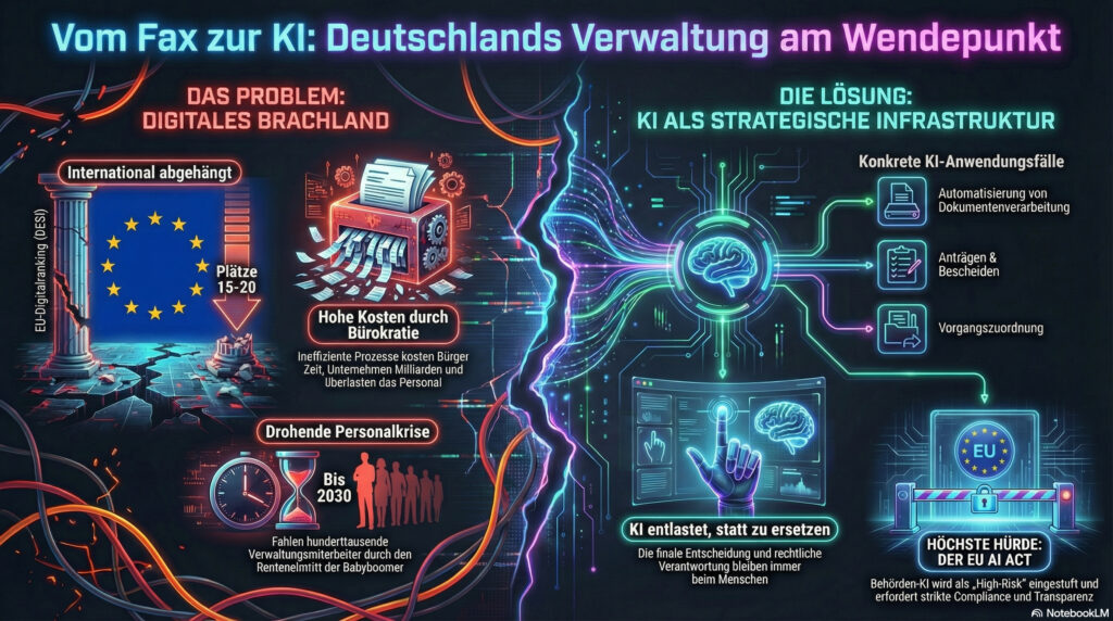 Deutschland steht genau jetzt an einem Wendepunkt. Künstliche Intelligenz könnte unsere Verwaltung fundamental transformieren, vom bürokratischen Hindernis zur digitalen Servicemaschine. Die Frage ist nicht mehr ob, sondern wie schnell und vor allem wie verantwortungsvoll wir diese Transformation gestalten.